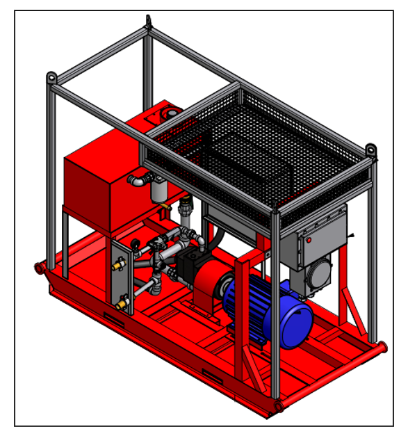 The Hydraulic power units is designed to provide a hydraulic system pressure up to 3500 PSI. It is a skid mounted electric motor driven Hydraulic power unit. The unit consists of the electric Motor and starter, hydraulic reservoir with hydraulic pump and pressure regulating components; an air cooled radiator type heat exchanger, starter and hoses for interconnection to the tong or other equipment to be powered. The unit components are installed on a skid having forklift lift provision and a centrally-located lifting eye facilitates hoisting the unit to the drill floor or to other desired location